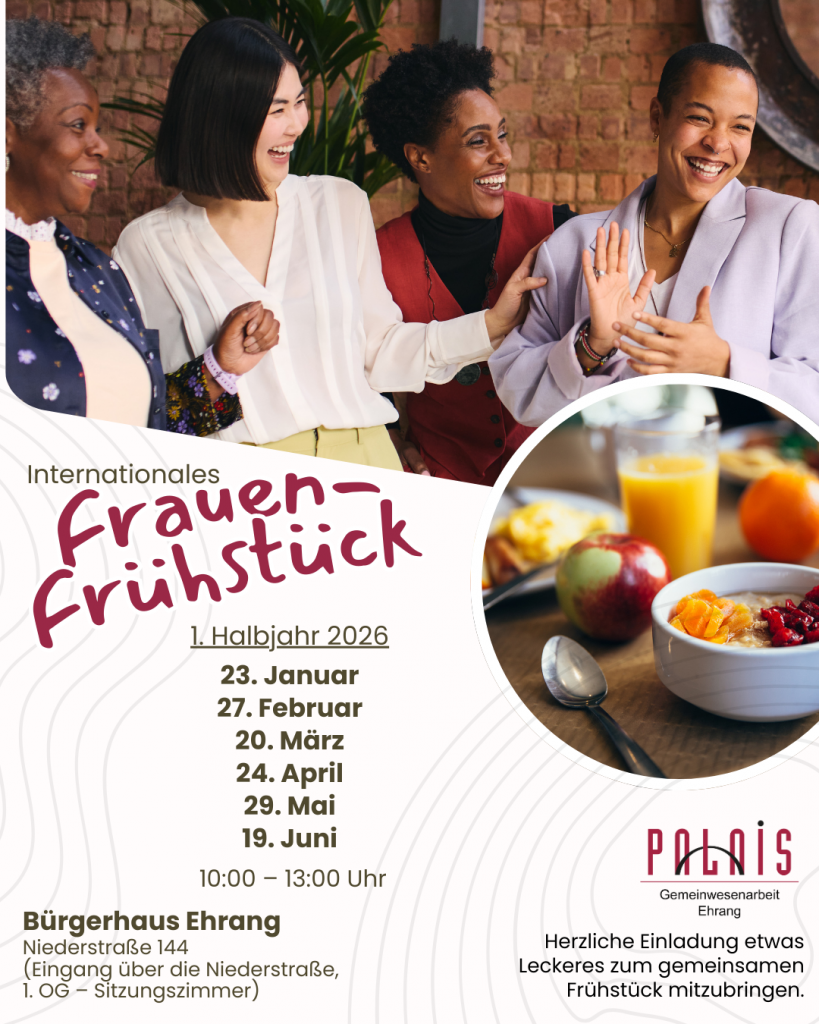 Du hast Lust auf einen entspannten Vormittag in netter Gesellschaft, bei leckerem Frühstück und spannenden Gesprächen? Dann komm zu unserem Internationalen Frauenfrühstück im Bürgerhaus Ehrang in Sitzungszimmer 1. OG (Eingang über die Niederstrasse 144)!