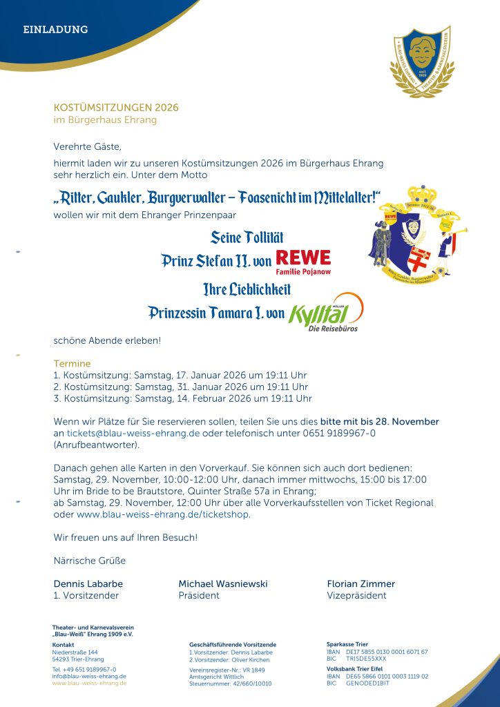 hiermit laden wir zu unseren Kostümsitzungen 2026 im Bürgerhaus Ehrang